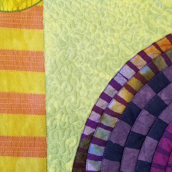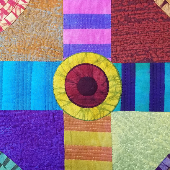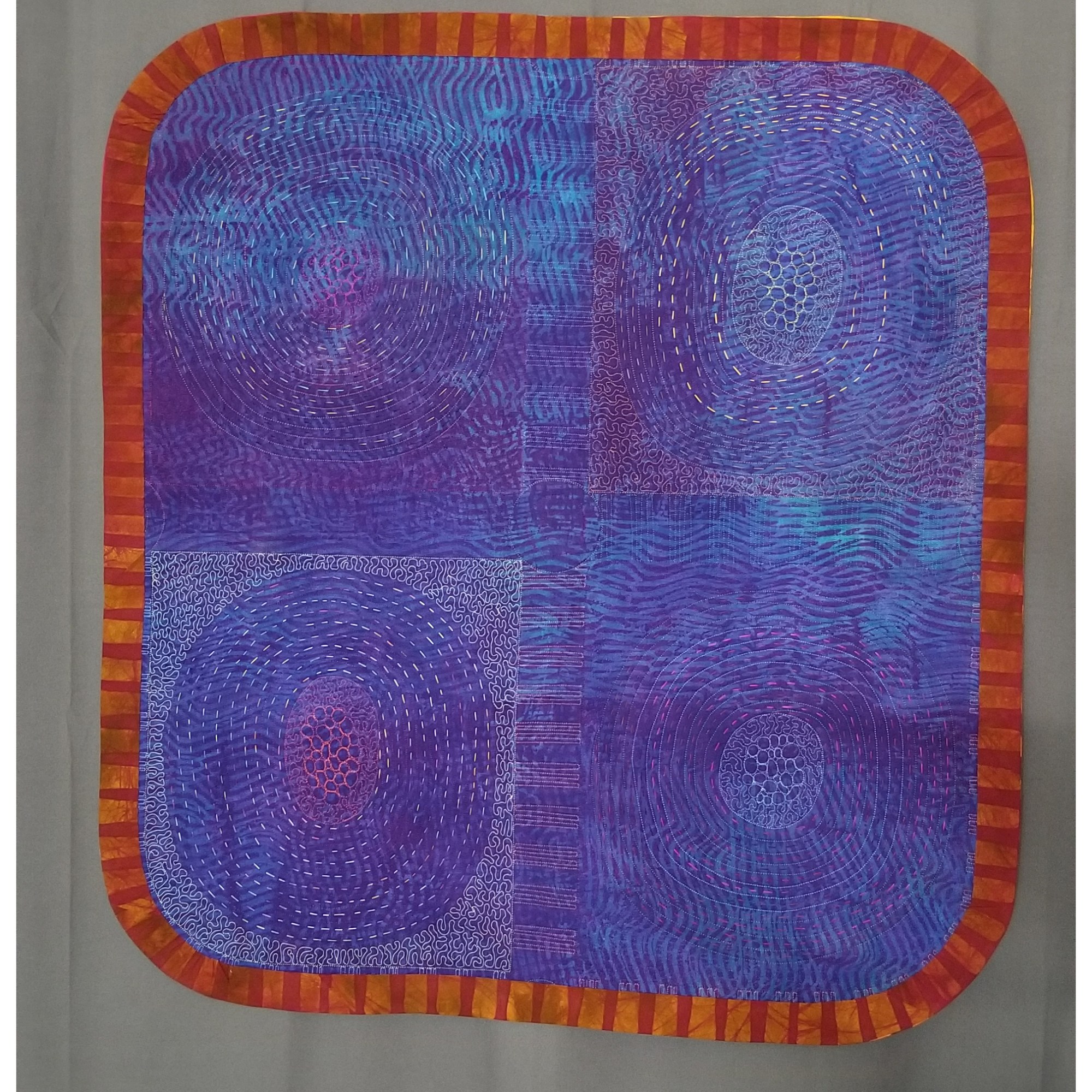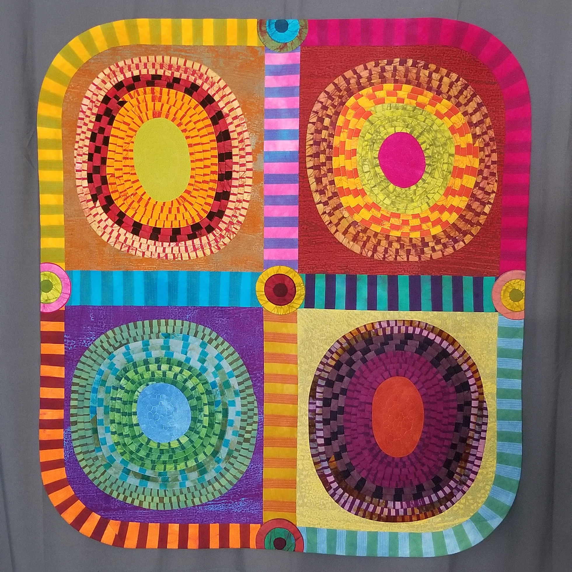 This piece is called Hypno-DYE-zed. All of the fabric was hand batiked, hand dyed and dye painted. The main circular motifs are bias strips. The outer bands are cut on the bias, but printed with the stripe at the opposite angle go give a horizontal effect.